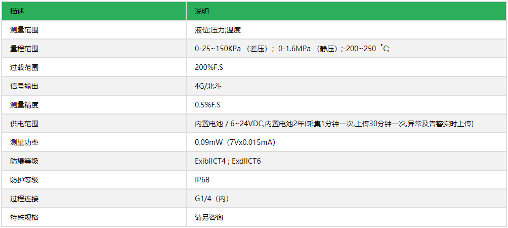 | 供电范围 | 内置电池 / 6~24VDC,内置电池2年(采集1分钟一次,上传30分钟一次,异常及告警实时上传) |