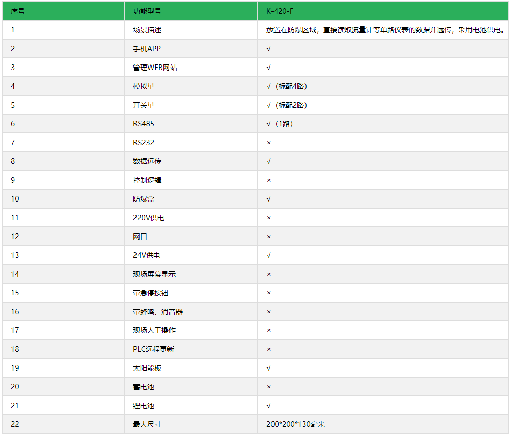 | 1 | 场景描述 | 放置在防爆区域,直接读取流量计等单路仪表的数据并远传,采用电池供电。 |