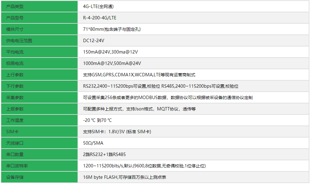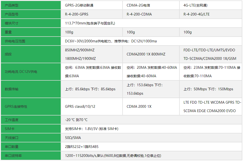 | 产品型号 | R-4-200-GPRS | R-4-200-CDMA | R-4-200-4G/LTE |