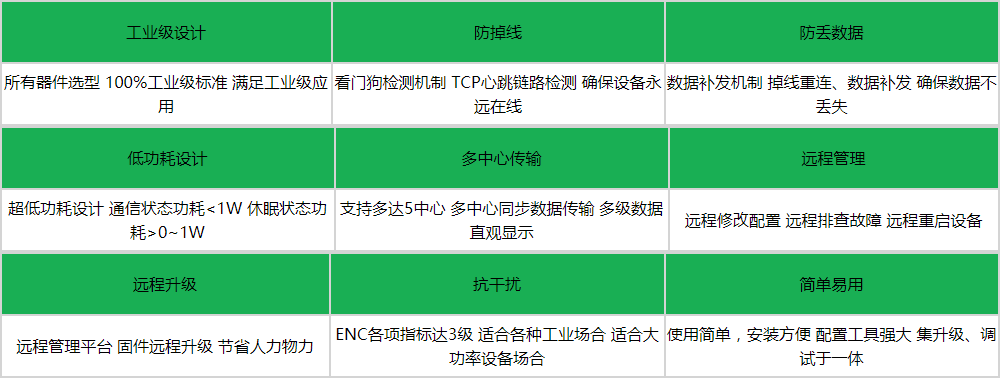 | 超低功耗设计 通信状态功耗<1W 休眠状态功耗>0~1W | 支持多达5中心 多中心同步数据传输 多级数据直观显示 | 远程修改配置 远程排查故障 远程重启设备 |