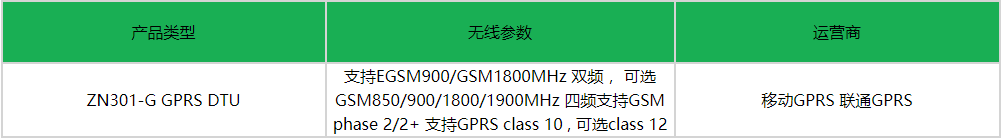 | ZN301-G GPRS RTU | 支持EGSM900/GSM1800MHz 双频, 可选GSM850/900/1800/1900MHz 四频支持GSM phase 2/2+ 支持GPRS class 10 , 可选class 12 | 移动GPRS 联通GPRS |